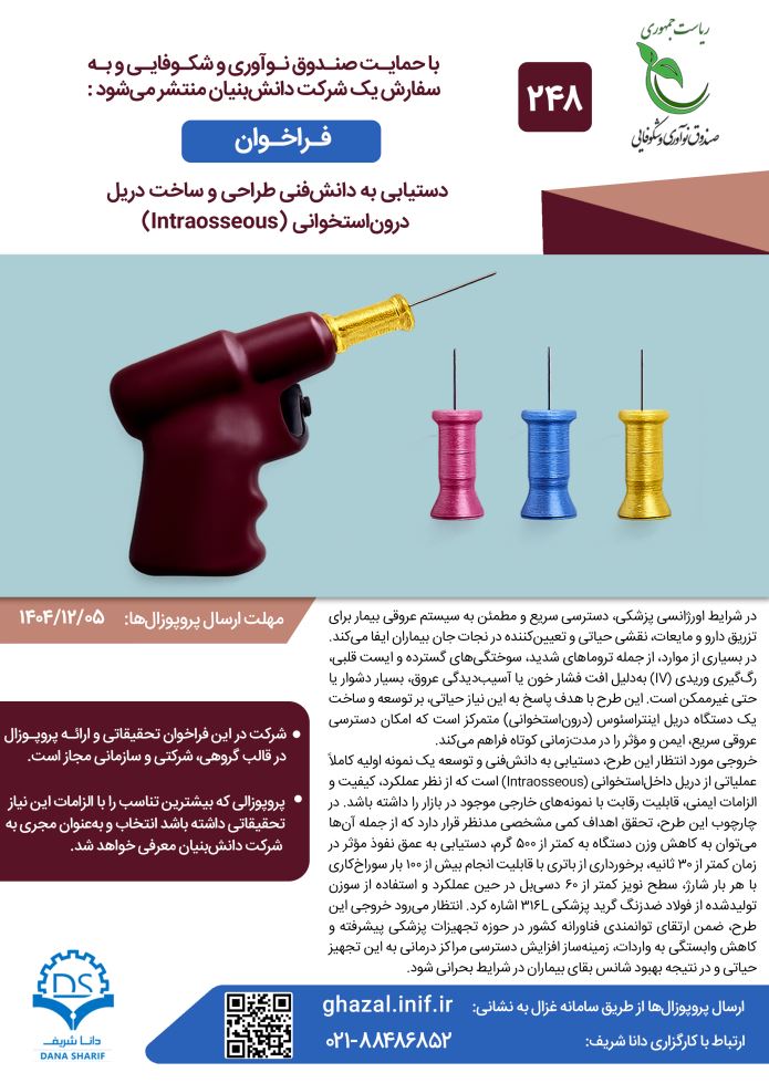 فراخوان مشارکت در اکتساب فناوري با حمایت صندوق نوآوري و شکوفایی ریاست جمهوري موضوع: دستیابی به دانش فنی طراحی و ساخت دریل درون استخوانی (intraosseous) معرفی کارشناسان صندوق نوآوري و شکوفایی جهت پاسخ به سوالات: سرکار خانم زرگوش، شماره تماس 42170314 سرکار خانم پیشبین، شماره تماس 42170305 سرکار خانم عابدي، شماره تماس 42170318