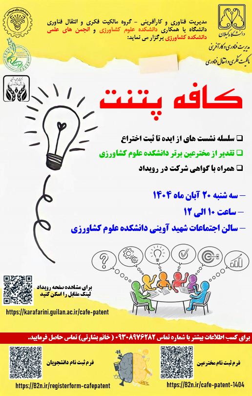 نخستین رویداد «کافه پتنت» با همکاری دانشکده علوم کشاورزی، انجمن های علمی دانشکده و اتحادیه زراعت، گیاه‌پزشکی و بیوتکنولوژی ایران و شرکت پویشگران نوآور هیرکانی، در تاریخ ۲۰ آبان‌ماه ۱۴۰۴ از ساعت ۱۰ تا ۱۲ در تالار شهید آوینی دانشکده کشاورزی دانشگاه برگزار شد. در این رویداد که با حضور جمعی از اعضای هیات علمی، پژوهشگران و دانشجویان علاقه‌مند همراه بود، روش‌های صحیح و اصولی ثبت اختراع، فرآیندهای ارزیابی و حمایت‌های موجود در دانشگاه معرفی شد و کارگزار رسمی ثبت اختراع دانشگاه نیز به حاضران معرفی گردید.   در ادامه، به منظور تجلیل از فعالیت‌های فناورانه و نوآورانه دانشگاهیان، از مخترعان و اعضای هیات علمی فعال دانشکده علوم کشاورزی که موفق به ثبت اختراع یا ثبت ژن و کشف گونه شده‌اند، تقدیر به عمل آمد. این رویداد به عنوان نخستین برنامه از سلسله رویدادهای «کافه پتنت» طراحی شده و هدف آن تقویت فرهنگ نوآوری و اختراع و آشنایی دانشجویان با مسیر تجاری‌سازی ایده‌ها و حفاظت از مالکیت فکری دستاوردهای دانشگاهی است.   گفتنی است رویدادهای بعدی «کافه پتنت» جهت برگزاری در سایر دانشکده های دانشگاه برنامه ریزی شده است.   ویدئو رویداد کافه پتنت 20 آبان ماه 1404