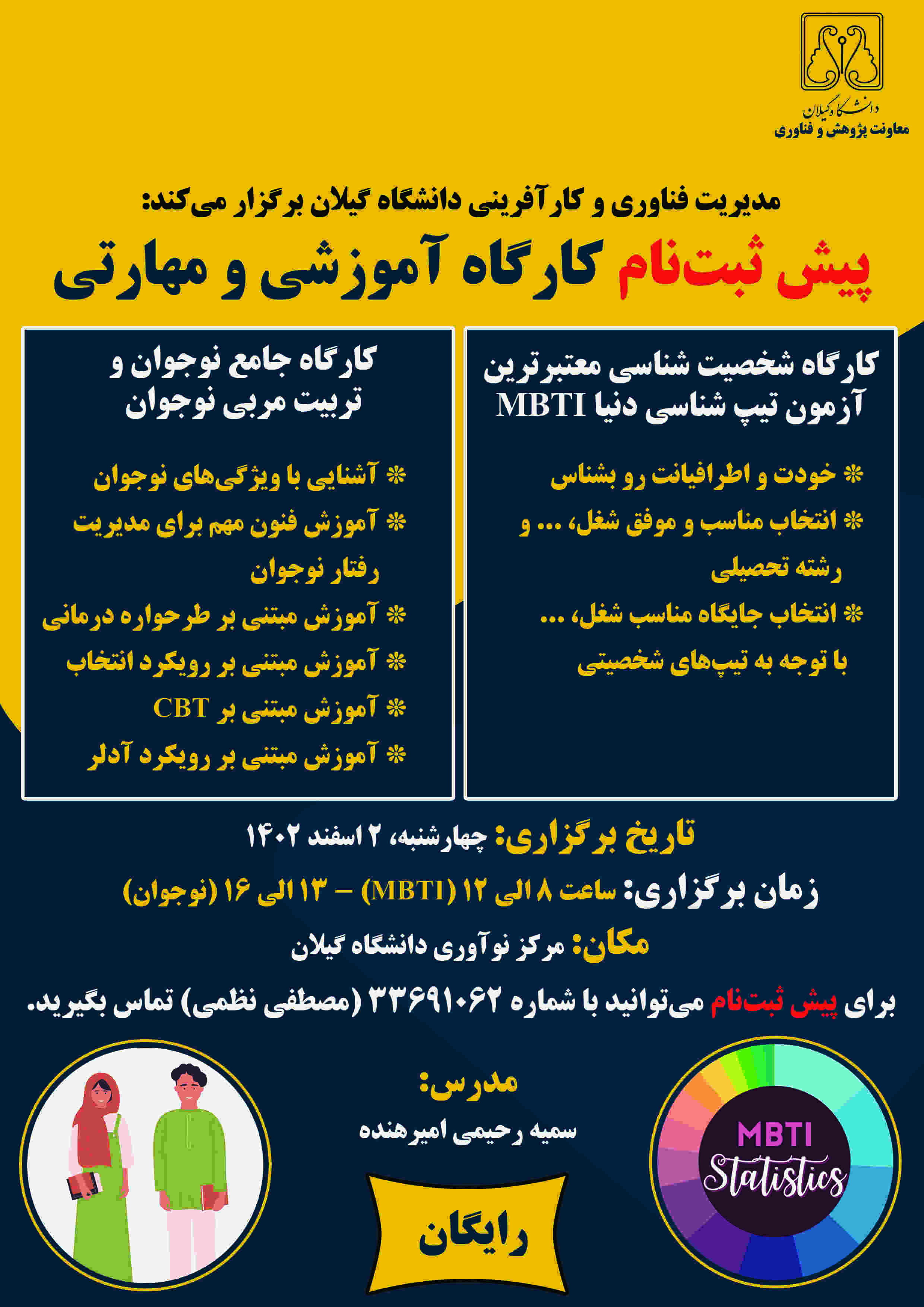 پيش ثبت‌نام كارگاه آموزشي و مهارتي « كارگاه شخصيت شناسي معتبرترين آزمون تيپ شناسي دنيا MBTI» و «كارگاه جامع نوجوان و تربيت مربي نوجوان»