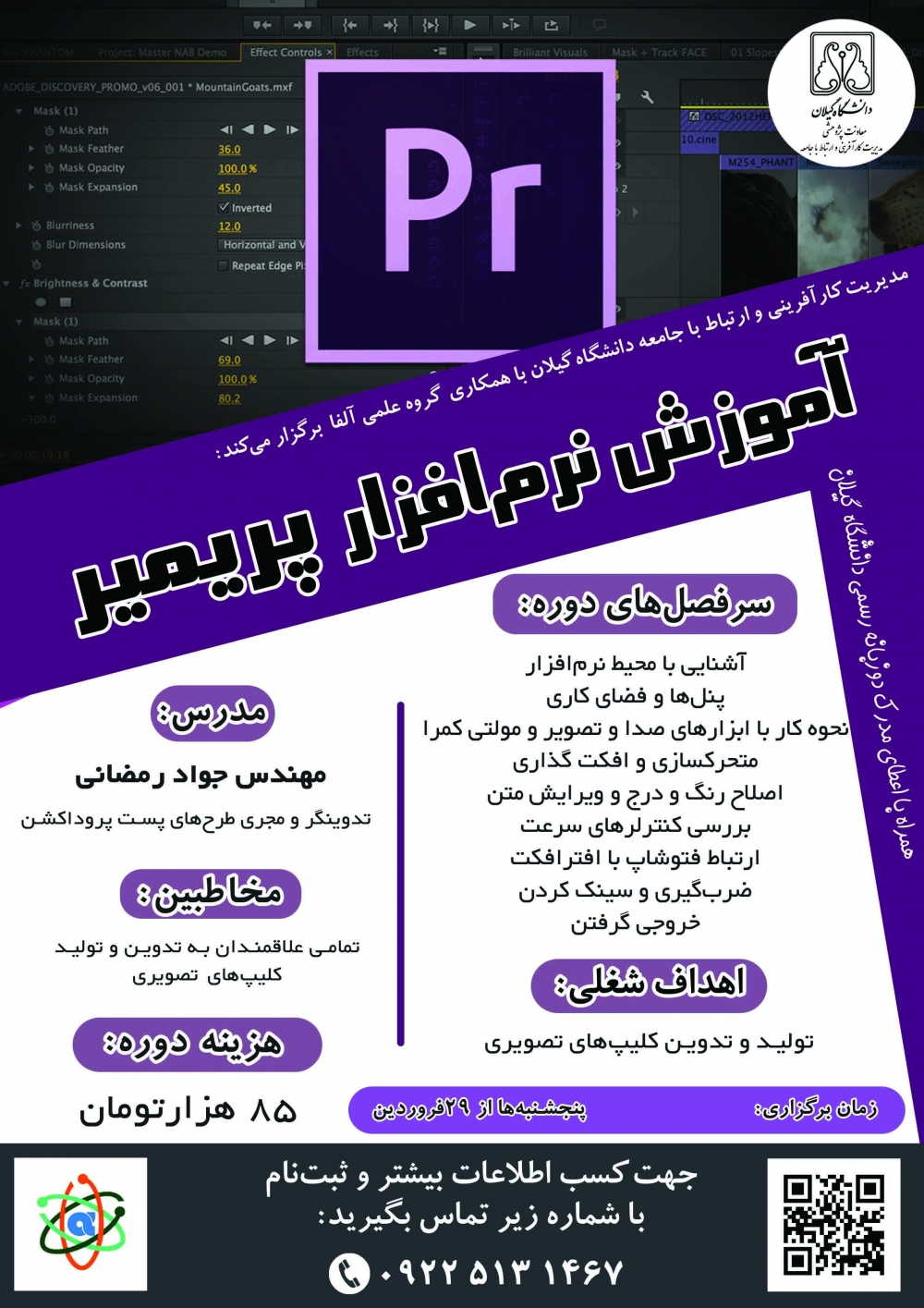 مدیریت کارآفرینی و ارتباط با جامعه دانشگاه گیلان با هدف ترویج کارآفرینی و آموزش مهارتافزایی و توانمندسازی دانشجویان، کارگاه ها و دورههای آموزشی- مهارتی زیر را در بهار 1398 برگزار مینماید. از علاقمندان دعوت می شود جهت کسب اطلاعات بیشتر و ثبت نام با شماره 33690242-013 ویا 09225131467 تماس حاصل فرمایند.