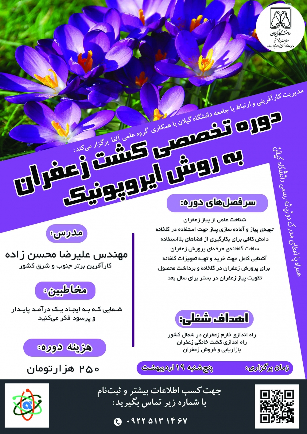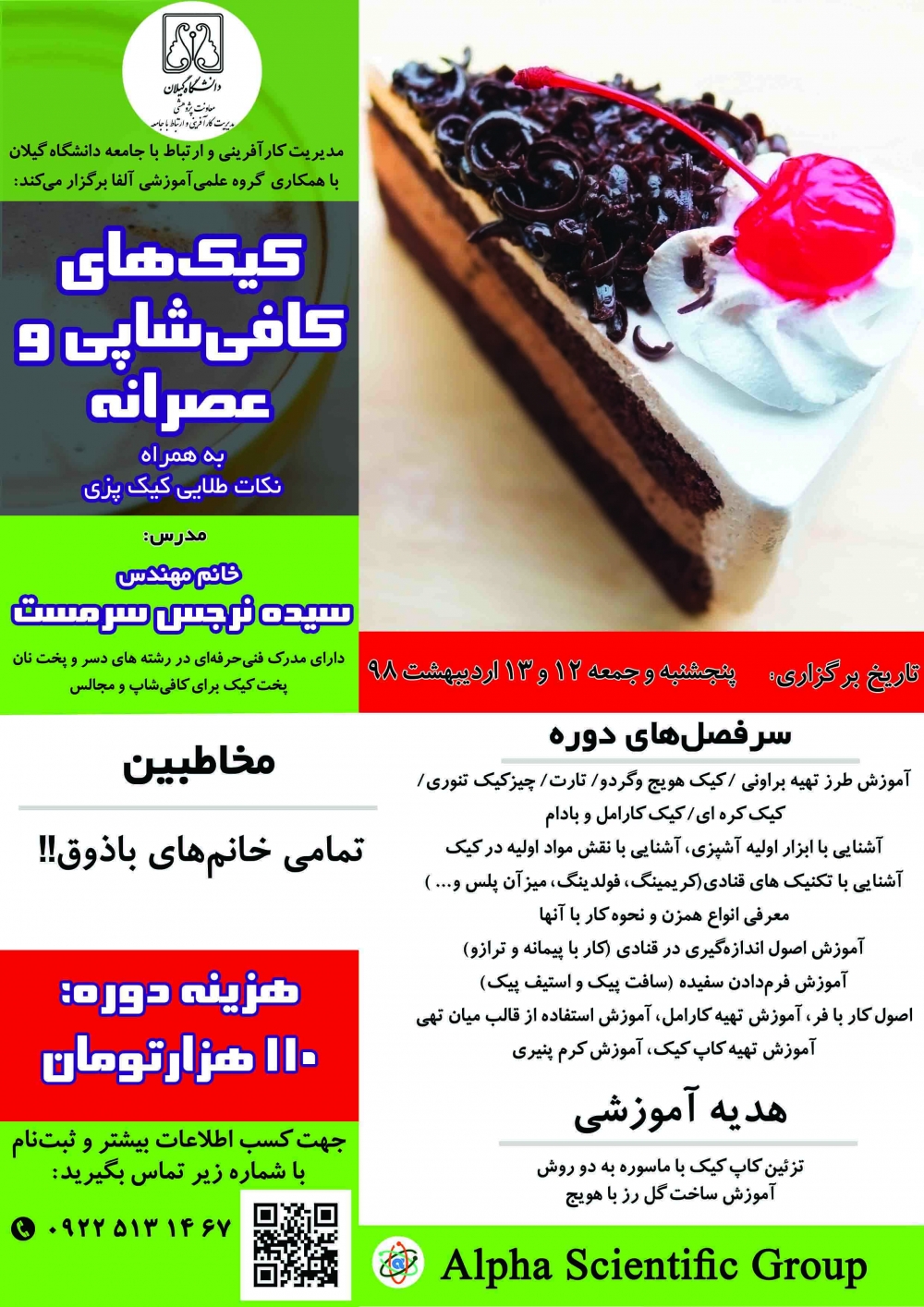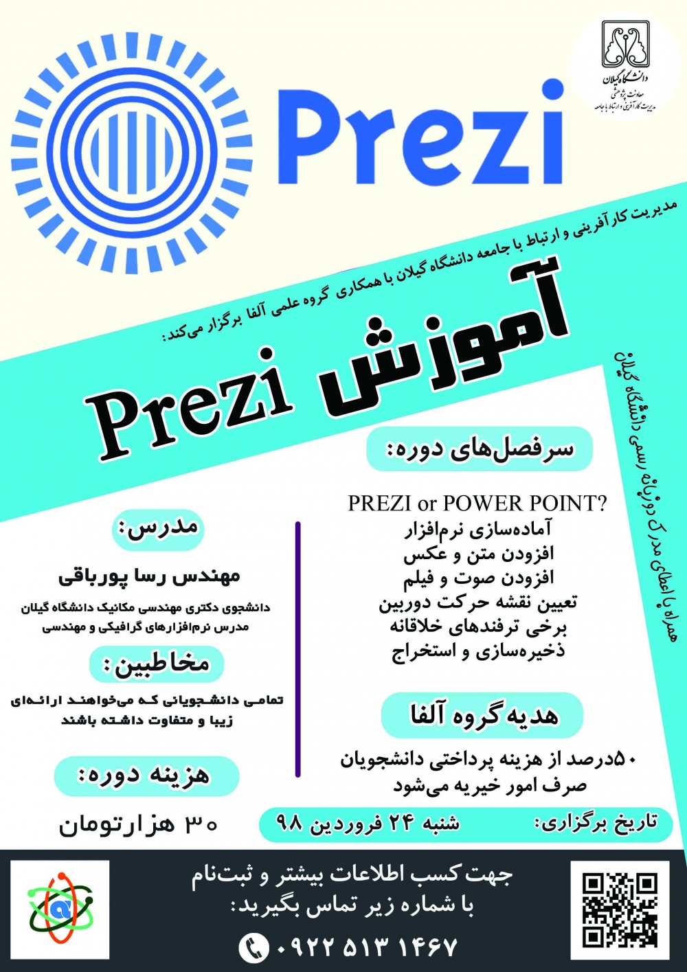 مدیریت کارآفرینی و ارتباط با جامعه دانشگاه گیلان با هدف ترویج کارآفرینی و آموزش مهارت‌افزایی و توانمندسازی دانشجویان، کارگاه ها و دوره‌های آموزشی- مهارتی زیر را در بهار 1398 برگزار می‌نماید. از علاقمندان دعوت می شود جهت کسب اطلاعات بیشتر و ثبت نام با شماره 33690242-013 ویا 09225131467 تماس حاصل فرمایند.