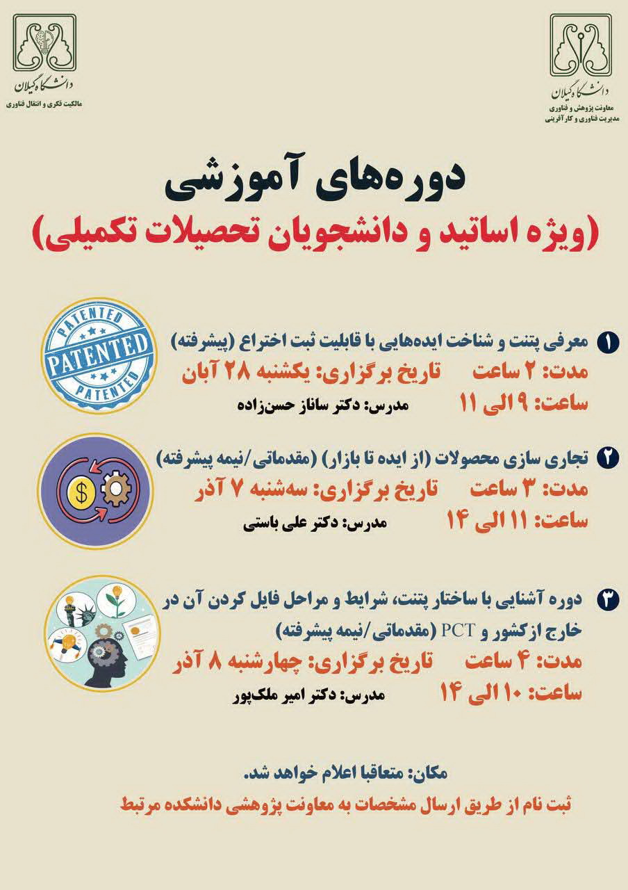 نخستین رویداد «کافه پتنت» با همکاری دانشکده علوم کشاورزی، انجمن های علمی دانشکده و اتحادیه زراعت، گیاه‌پزشکی و بیوتکنولوژی ایران و شرکت پویشگران نوآور هیرکانی، در تاریخ ۲۰ آبان‌ماه ۱۴۰۴ از ساعت ۱۰ تا ۱۲ در تالار شهید آوینی دانشکده کشاورزی دانشگاه برگزار شد. در این رویداد که با حضور جمعی از اعضای هیات علمی، پژوهشگران و دانشجویان علاقه‌مند همراه بود، روش‌های صحیح و اصولی ثبت اختراع، فرآیندهای ارزیابی و حمایت‌های موجود در دانشگاه معرفی شد و کارگزار رسمی ثبت اختراع دانشگاه نیز به حاضران معرفی گردید.   در ادامه، به منظور تجلیل از فعالیت‌های فناورانه و نوآورانه دانشگاهیان، از مخترعان و اعضای هیات علمی فعال دانشکده علوم کشاورزی که موفق به ثبت اختراع یا ثبت ژن و کشف گونه شده‌اند، تقدیر به عمل آمد. این رویداد به عنوان نخستین برنامه از سلسله رویدادهای «کافه پتنت» طراحی شده و هدف آن تقویت فرهنگ نوآوری و اختراع و آشنایی دانشجویان با مسیر تجاری‌سازی ایده‌ها و حفاظت از مالکیت فکری دستاوردهای دانشگاهی است.   گفتنی است رویدادهای بعدی «کافه پتنت» جهت برگزاری در سایر دانشکده های دانشگاه برنامه ریزی شده است.   ویدئو رویداد کافه پتنت 20 آبان ماه 1404